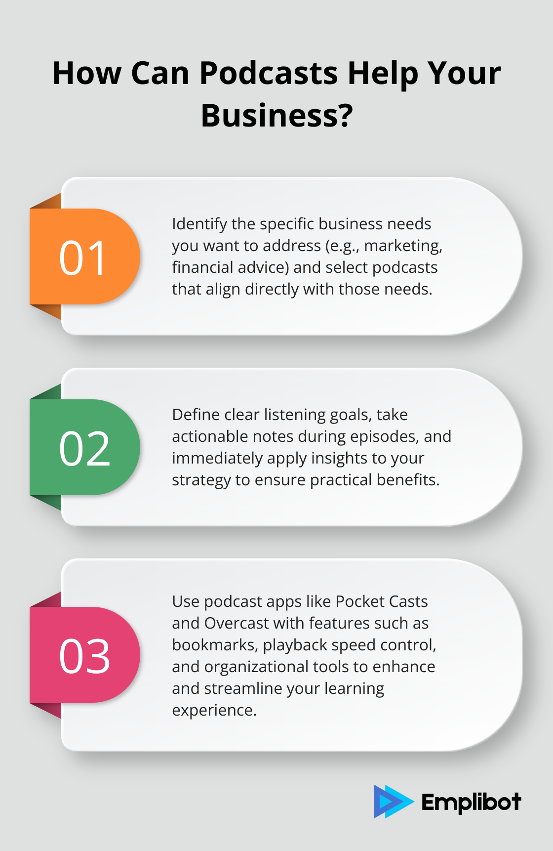 For a more comprehensive approach to your business content, Emplibot offers an automated solution for publishing SEO-friendly articles to your WordPress site. This can complement your learnings from podcasts and further boost your growth strategy. Embrace these tools and keep evolving.