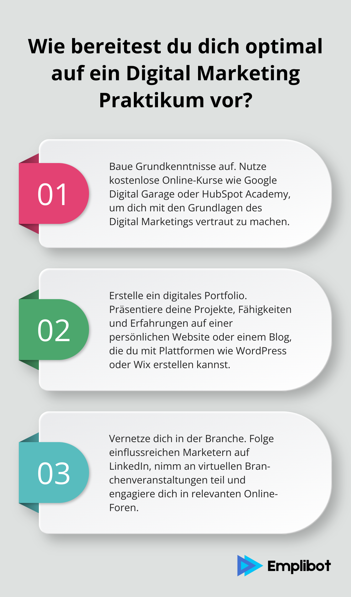 Dein Praktikum ist erst der Anfang einer spannenden Reise im Digital Marketing. Mit den richtigen Skills, Netzwerken und Lernbereitschaft stehen dir alle Türen offen. Nutze Tools wie Emplibot zur Optimierung deiner Content-Strategie (und bleibe so der Konkurrenz immer einen Schritt voraus).